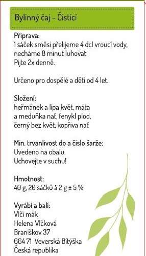 Složení: heřmánkový a lipový květ,meduňková a mátová nať,fenyklový plod,kopřivová nať,černého bezu květ