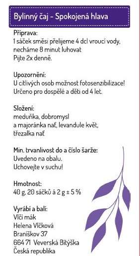 Složení: meduňková, dobromyslová, majoránková nať, levandulový květ, třezalková nať