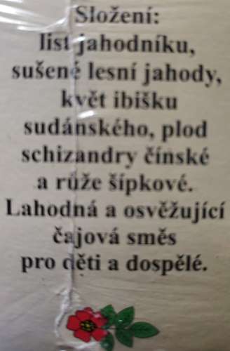 list jahodníku, sušené lesní jahody, květ ibišku sudánského, plod schizandry čínské a růže šípkové.